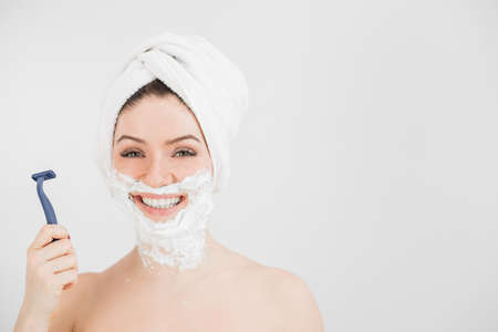 Cheerful caucasian woman with a towel on her head and shaving foam on her face holds a razor on a white background