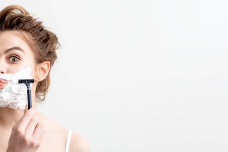 Funny portrait of a woman with shaving foam on her face holding a razor on a white background. The girl removes the mustache and beard