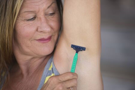 Portrait active fit sporty attractive mature woman shaving under arm, happy relaxed, blurred background, copy space.