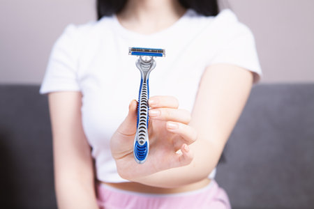 attractive girl holding in hand razor shaver blade i