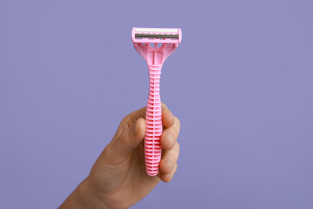Female hand with razor on purple background