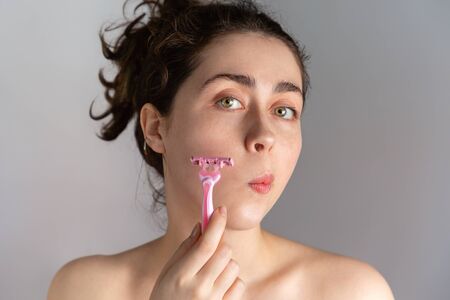 A young woman with a sad grin holds a razor to her lips. The concept of getting rid of unwanted hair. Close up.