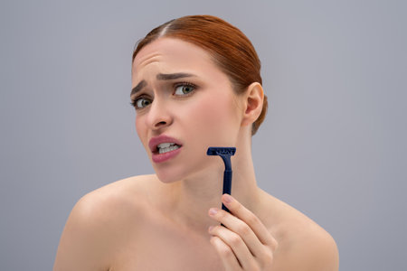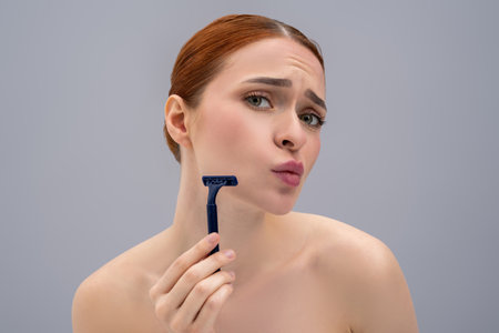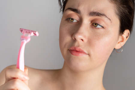 A young pretty woman with a dissatisfied expression is holding a razor in her hands. The concept of getting rid of unwanted hair