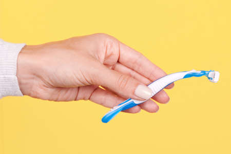 Female hand holds lot of colored disposable razors of epilators on yellow background. Beauty and fashion shot