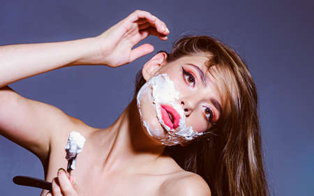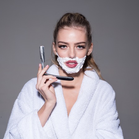Girl moustache. Barber and shaving concept. Woman with face covered with foam holds straight razor in hand. Girl on busy face wears bathrobe. Lady shaves her face with sharp blade of straight razor.