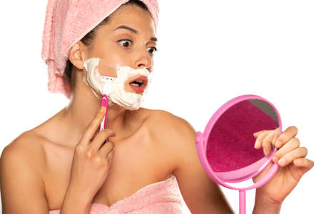 Young worried woman shaves her face on white background