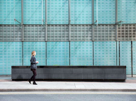 London, United Kingdom, 7 may 2017: girl walks on street before green blue wall in canary wharf which is the business district full of modern futuristic buildings in london