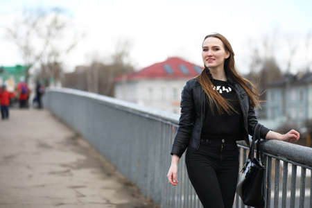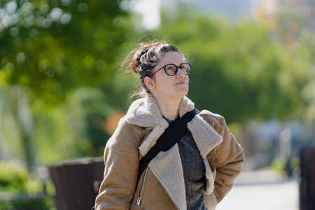 Attractive young woman outside in the park . Caucasian girl with long brown hair