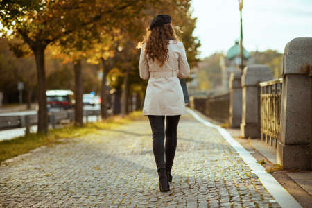 Full length side view portrait of trendy caucasian woman walking outdoors