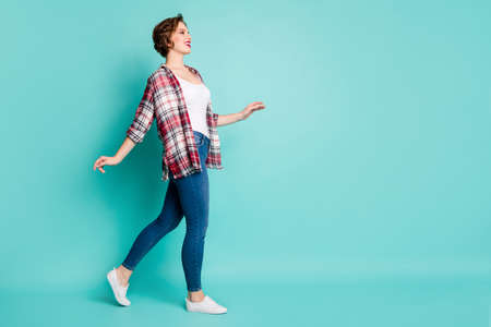 Full length body size side profile photo of girl walking fast smiling isolated on bright blue color background