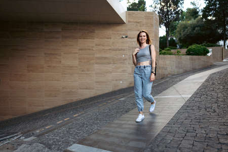 Young beautiful stylish woman, in casual clothes, walking down the street in front of a gray biton wall, with a mobile phone