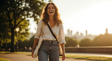 Smiling Woman Walking Outdoors in City Park at Golden Hour