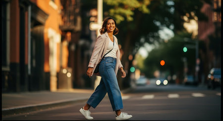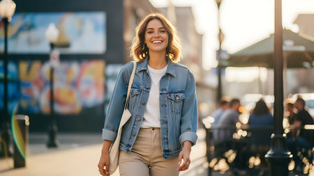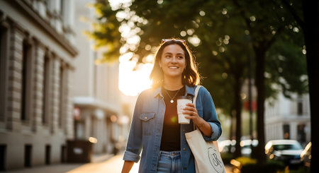 A smiling young woman walks down a city street, holding a coffee cup and tote bag, with a blurred background of buildings, trees, and cars during sunset.