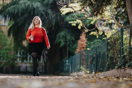 Woman walking along a park path with coffee in autumn red sweater and black outfit