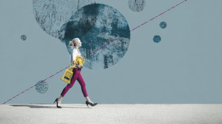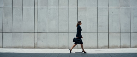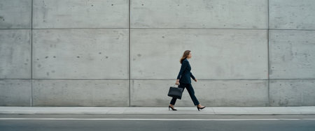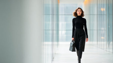 A stylish businesswoman confidently walks down a modern office corridor. Dressed in professional attire, she carries a handbag, showcasing elegance and determination in an urban environment.