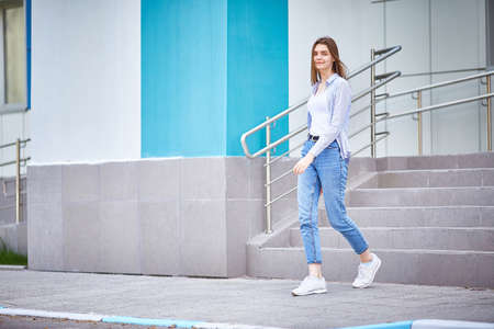 young woman leaves the building and walks down the steps. A teenager during the summer holidays and vacations