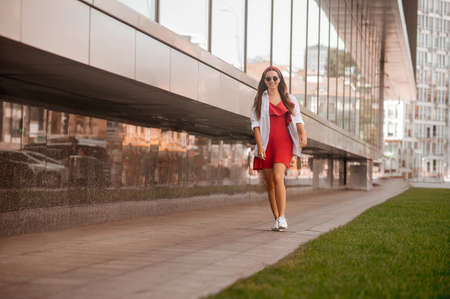 A business woman in a coat and suit, holding a bag in her hand, walks near the business center during the day. Conceptual horizontal photo