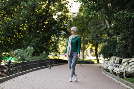 Full length portrait of beautiful smiling stylish muslim woman with in hijab walking in summer city park. Street style, summer, outdoor, break concept. Walking down the sunny park.