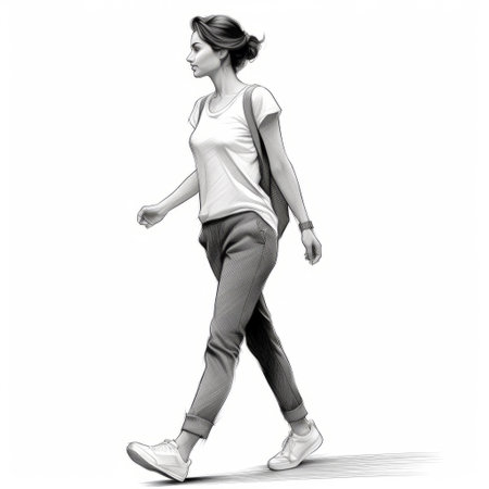 a profile view illustration of a spokeswoman with short hair walking confidently. the sketch features a full body shot against a white background, with a tree in the backdrop. the woman is depicted with her hands in her pockets, wearing sport shoes. the sketch is kept simple and devoid of colors. ai generated