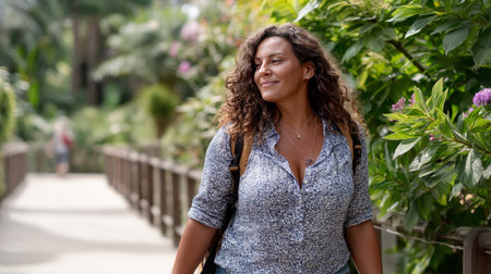 A curvy woman enjoying a leisurely walk through a botanical garden, feeling connected to nature