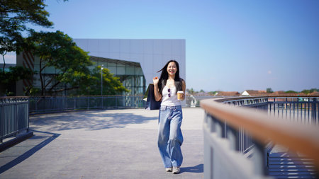 asian young woman carrying shopping bags and holding coffee at the Rooftop walkway shopping mall.