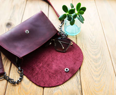 Leather bag and eyeglasses on a wooden background