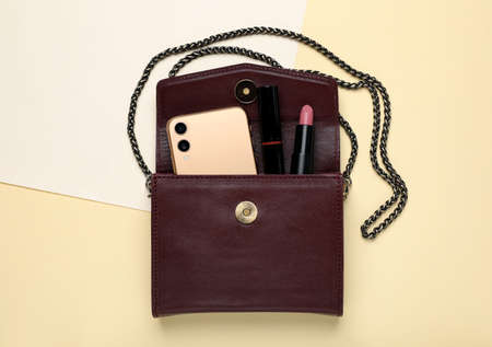 womens bag and cosmetics on a colored background