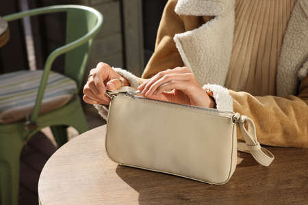 Fashionable woman with stylish bag at table in outdoor cafe, closeup
