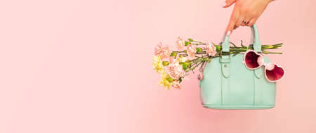 Fashion spring accessories for woman - banner. Small mint green handbag (purse), heart shaped sunglasses and flowers on pastel pink background. Free copy (text) space.