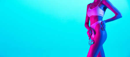 Massaging. Beautiful female body on blue background in purple neon. Beauty, cosmetics, spa, depilation, diet and treatment, fitness concept. Fit and sportive, sensual body with well-kept skin. Flyer