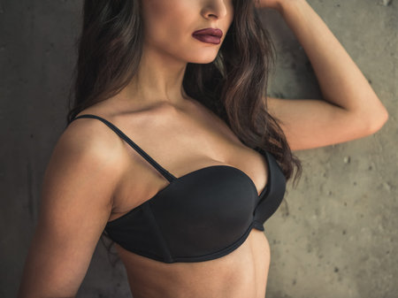 Sexiness and sensuality. Young attractive woman holding touching her breast bra. Seductive lady with hands on chest black brassiere.