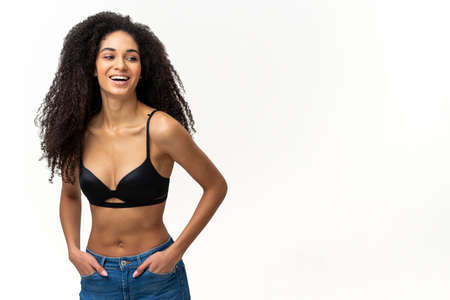 Studio portrait on the white background of carefree serene young woman looking aside and laughs. Cheerful peaceful multiracial lady with fit athletic body typify self love and body care