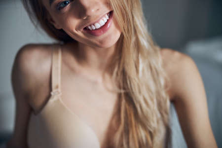 Woman is showing a new bra in the hand. Choosing a new bra concept.