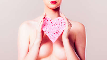Skincare hygiene medicine and body treatment. Sensual naked woman with beautiful figure perfect skin holding pink heart shaped sponge in hands.