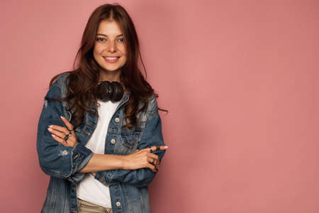 Dark-haired girl in jeans stands on a pink background with headphones on her neck and smiles with her arms crossed over her chest
