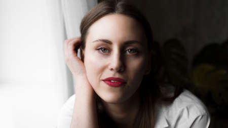 Portrait of attractive brunette woman. Home portrait of a woman with red lips in a white shirt