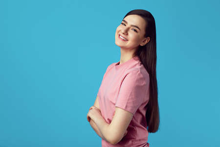 Cute female in pink tshirt smiling and standing with hands crossed on blue