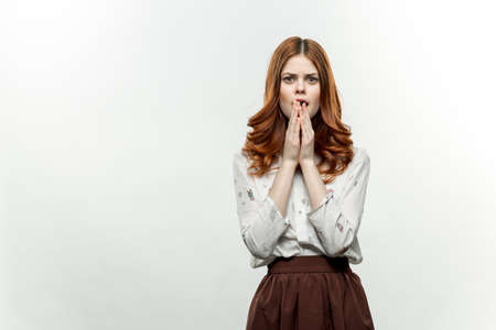 Beautiful woman surprised, woman folded her palms together on a light background.