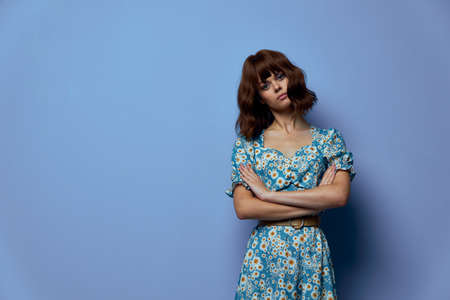 Photo of smiling, cheerful young female in grey dress on blue background. Emotional portrait