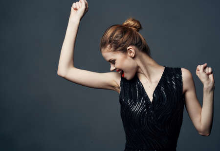Elegant lady in a black dress on a gray background gestures with her hands emotions surprise joy