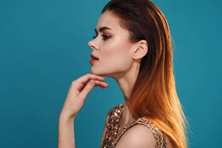 Beautiful woman with wavy hair bright makeup red t shirt lifestyle blue background model