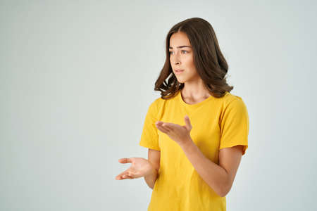 cheerful woman in a striped t-shirt gesture with his hands light background