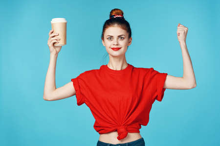 cheerful woman in red t-shirt with cup of coffee cropped view isolated background