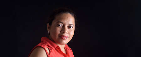 Portrait of beautiful mature brunette woman dressed in white hoodie isolated on black backdrop, copy space
