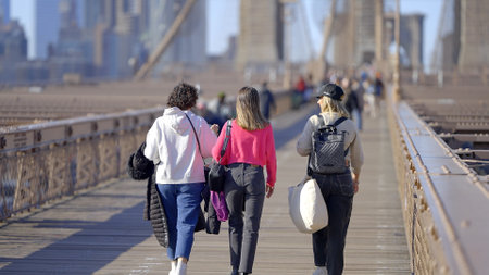 Walking over Brooklyn Bridge New York on a sunny day - NEW YORK CITY, USA - FEBRUARY 14, 2023