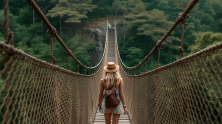 Young woman with backpack walking on suspension bridge in the forest. Back view.