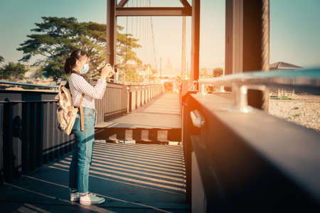 Backpacker travel during the pandemic outbreak, safe and health care, the new normal.