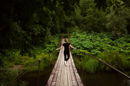 Young woman walking on a suspension bridge in the forest, back view