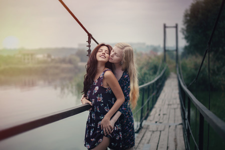 two beautiful young girlfriends blonde and brunette embracing on lake bridge on evening sunst. Rural scene. Women lesbians, hugging each other