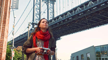 Smiling woman with a retro camera in New York